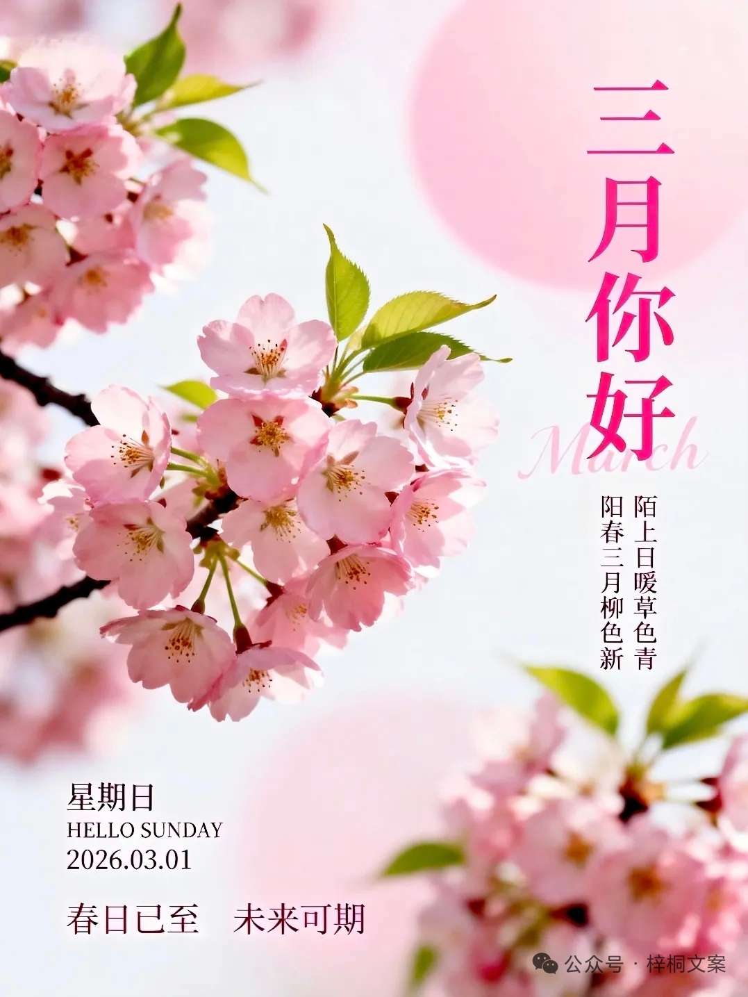 今天是3月1日,星期日!三月的第一条祝福:我想送给你,除了祝福,还希望你健康,除了好运,还希望你发财,除了开心,还希望你幸福,祝我们在平安的基础上,策马扬鞭,锦上添花,人顺家兴旺,万事皆顺意,阳春三月初,人间花锦簇。今天是三月的第一天,遗憾和烦恼,会随风而去,美好和幸运,将与花同开,三月,祝你春风得意,一切顺利。一别家乡入