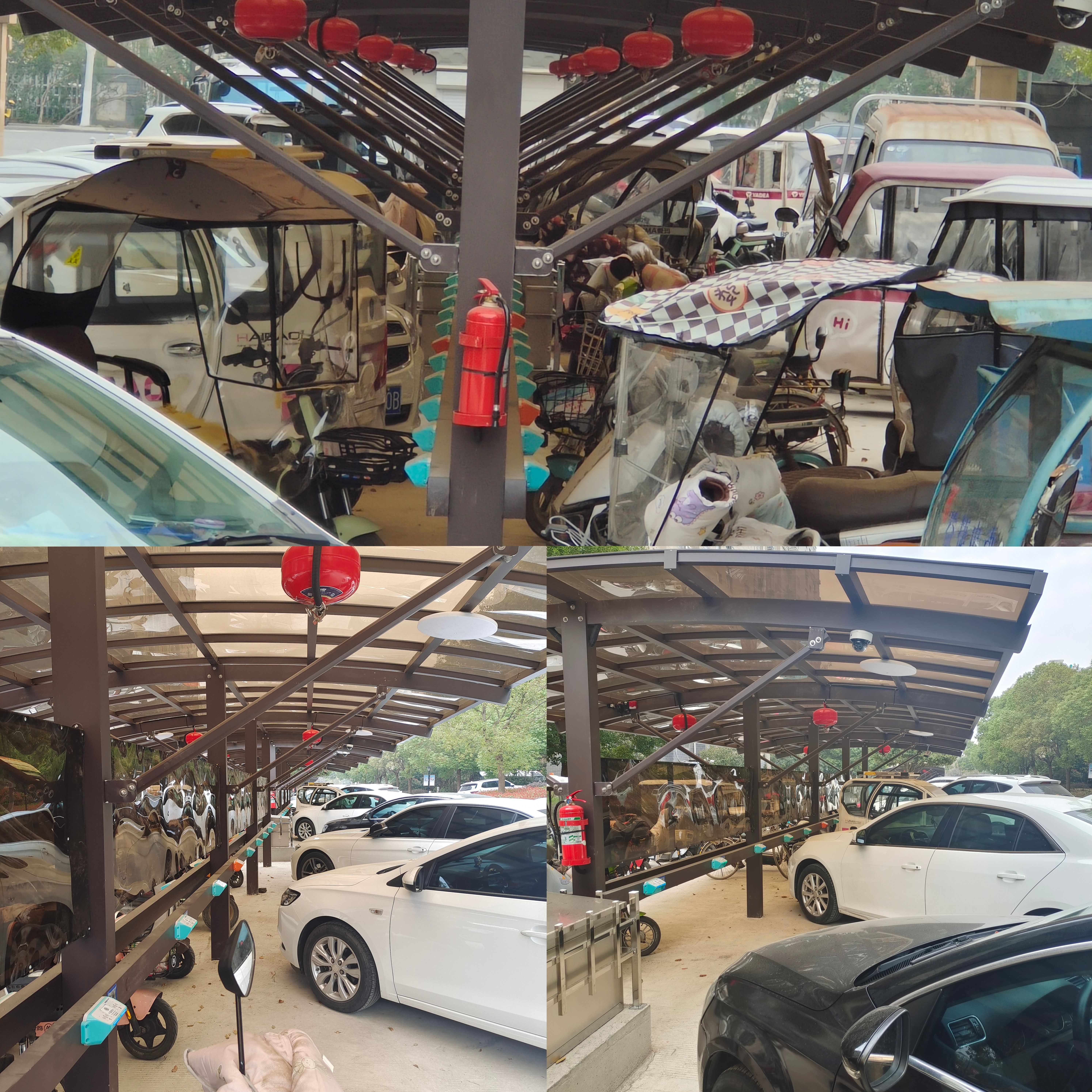 现在呢?电动自行车只能在未完工的车棚里“望桩兴叹”,由此带来的后果是:高层住户因电梯里电动自行车无法进入,室外又没有充电地方,而电动自行车又是居民出行刚需,无奈之下每晚还得找地方“飞线充电”,没有完工不能使用的充电棚,到了晚上就成了机动车的停车位。真是“充电难,难于上青天”!